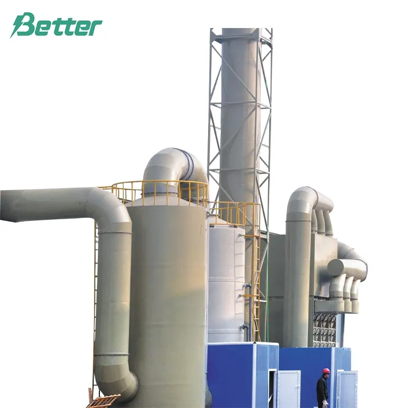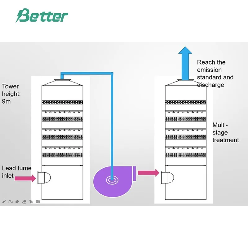 سوف يدخل الهواء المعالج بواسطة المعالجة المسبقة السابقة إلى جهاز الغسيل الرطب في إس تي عبر المنفاخ. سوف يرتفع دخان الرصاص إلى قسم الرش من المستوى الأول من أسفل جهاز الغسيل. سوف يرش سائل الامتصاص من الفوهات الموضوعة بشكل متساوٍ؛ سوف تتلامس قطرات الضباب الدقيقة العديدة مع الغاز وتتفاعل كيميائيًا. سوف يرتفع الغاز إلى طبقة التعبئة. إن اضطراب كرات التعبئة الصغيرة، مع القوة الديناميكية للرياح، سيجعل الرصاص في الطور الغازي لديه تفاعل نقل الكتلة الكيميائية مع المادة القلوية القوية في الرش. سوف تتدفق المادة المتفاعلة إلى خزان التخزين السفلي. أما الغاز الضار الذي لم يتم امتصاصه بالكامل فسوف ينتقل إلى قسم الرش في المستوى الثاني. سوف يرش سائل الامتصاص من الفوهات الموضوعة بشكل متساوٍ؛ سوف تتلامس قطرات الضباب الدقيقة العديدة مع الغاز وتستمر في التفاعل الكيميائي. تمامًا مثل عملية الامتصاص ذات المستوى الأول، سوف يدخل الغاز إلى مزيل الضباب الموجود أعلى جهاز الغسيل. سيتم إزالة سائل الامتصاص الموجود في الغاز وسيتم تفريغ الغاز النظيف في الغلاف الجوي من خلال مدخنة العادم.